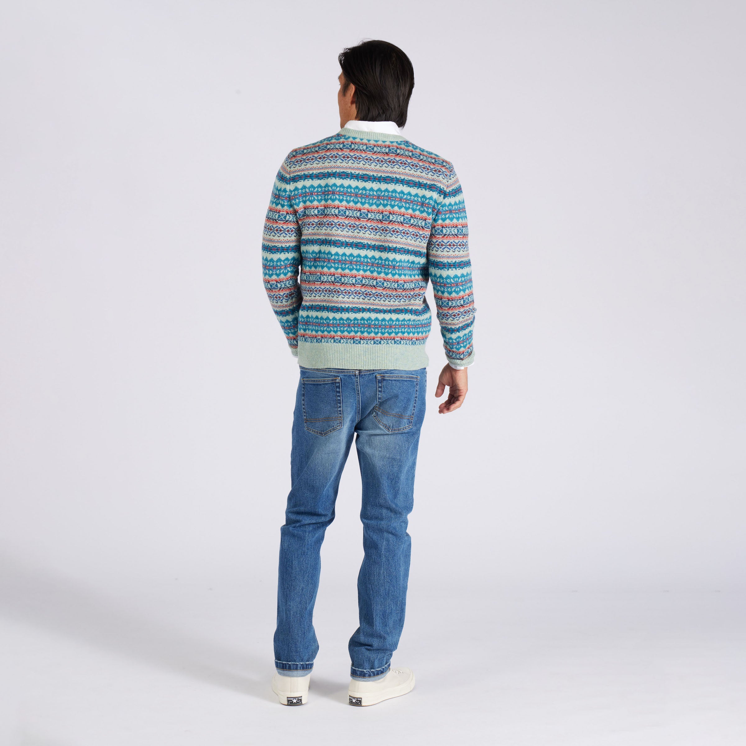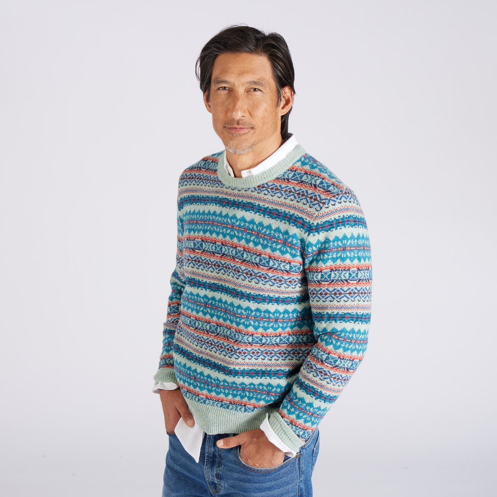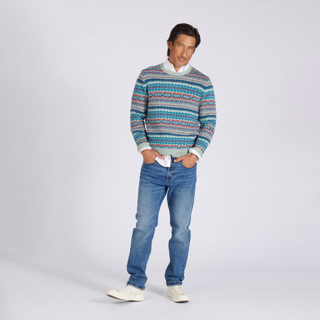 Everyone needs a surefire holiday sweater in their arsenal. This versatile exclusive comes in a Fair Isle pattern knit from the finest Donegal lambswool yarn. Knit with festive winter brights and dark tones in our original float jacquard pattern.